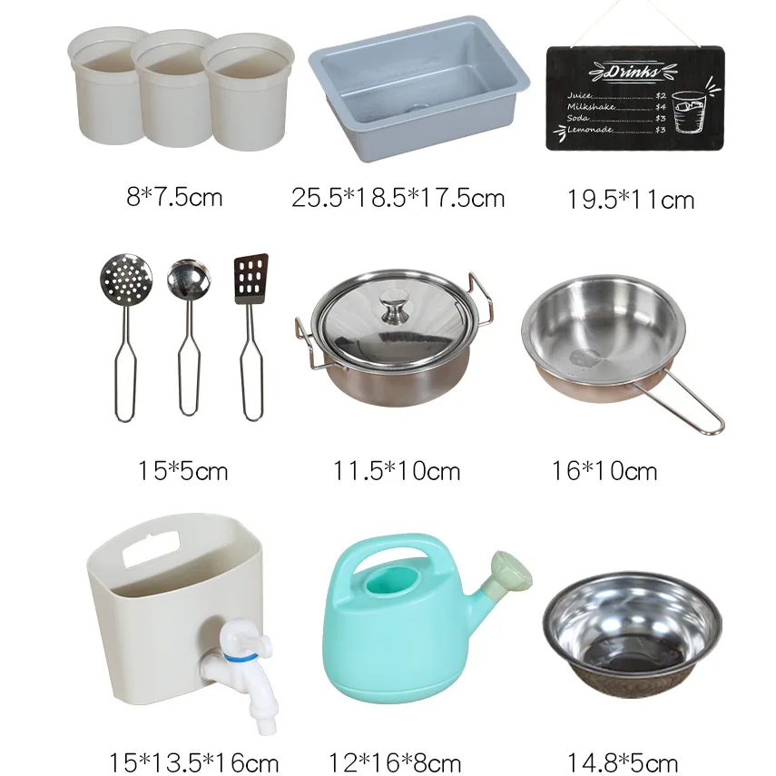 Incluye grifo funcional, fregadero extraíble, pizarra de menú, regadera, 3 maceteros, olla con tapa, sartén, bowl y 3 utensilios de cocina.